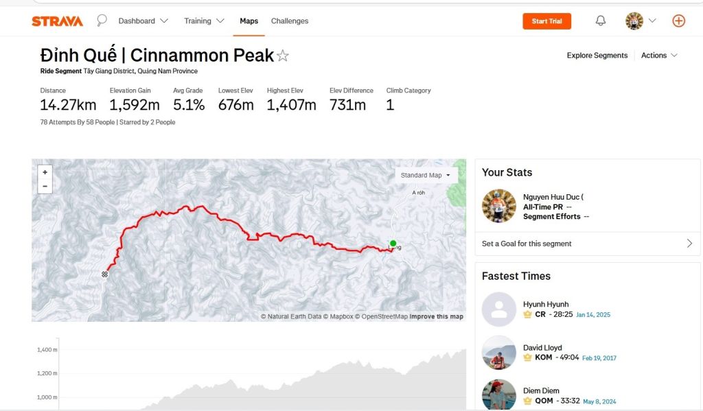 Articles Lifestyle Mr Old Man AI LEO ĐỈNH QUẾ THÌ LEO! By Mr Old Man Posted on February 18, 2025 12 min read 0 0 305 Share on Facebook Share on Twitter Share on Google+ Share on Reddit Share on Pinterest Share on Linkedin Share on Tumblr Đỉnh Quế (Photo: ST) Nhiều bạn có ý định đạp xe lên đỉnh Quế (Tây Giang, Quảng Nam) săn mây nhưng vẫn còn ngần ngại vì nghe đồn rằng đạp xe lên đỉnh Quế khó gấp 10 lần đạp xe leo đỉnh Khỉ Già. Vậy điều đồn đoán đó có đúng không? Câu trả lời là ĐÚNG và KHÔNG ĐÚNG. ĐÚNG nếu như bạn đạp một mạch từ Đà Nẵng lên đỉnh Quế bởi đỉnh Quế cách Đà Nẵng chừng 130 km và năm ở độ cao 1.400 m so với mực nước biển. Nếu như vậy, bạn không những đạp 130 km mà còn phải leo khoảng 4.000 m tổng độ cao, tương đương 7 lần leo Khỉ Già, cũng là con số không dễ dàng đối với những bạn mới chơi xe đạp. KHÔNG ĐÚNG nếu chỉ đạp xe từ chân đỉnh Quế leo lên đỉnh Quế. Theo một segment trên Strava (ảnh đính kèm), đoạn đường từ chân dốc lên đỉnh Quế dài 14,2 km, độ cao ở chân đốc là 676 m, độ cao ở đỉnh Quế là 1.407m (max elevation), như vậy, chênh lệch độ cao là 731 m, tính ra độ dốc bình quân của cung đỉnh Quế chỉ là 5,1%. Độ dốc này tuy thấp hơn độ dốc bình quân của đèo Hải Vân và chỉ bằng quá nửa độ dốc cung đường Khỉ Già nhưng leo cung đường dài 14,27 km lên đỉnh Quế sẽ đạt tổng độ cao 1.592 m bằng 2,8 lần leo đỉnh Khỉ Già, cũng không quá khó nhưng cũng không quá dễ dàng với những bạn mới chơi xe đạp. Có nhiều cách đạp xe lên đỉnh Quế: Cách 1 (có xe ô tô hậu cần hỗ trợ): Một nhóm bạn 3-5 người có thể rủ nhau đi ô tô từ Đà Nẵng tới chân đỉnh Quế rồi xuống xe đạp lên đỉnh Quế, đốt lửa trại qua đêm (trên đỉnh Quế cũng có kiểu “homestay”), sáng mai dậy sớm sân mây rồi đạp xe hoặc lên ô tô hậu cần về lại Đà Nẵng. Cách này nhẹ nhàng dành cho những bạn mới chơi xe đạp nhưng lại muốn có trải nghiệm leo đỉnh Quế. Trong ảnh segment Đỉnh Quế được Strava ghi lại, bạn có thể thấy các thông số đỉnh Quế, theo đó cung đường lên đỉnh Quế dài 14,2 km, điểm thấp nhất nằm ở độ cao 676 m so với mực nước biển, điểm cao nhất là 1.407 m, chênh lệc là 731m. Đạp xe leo từ chân dốc lên đỉnh dốc bạn sẽ đạt tổng độ cao 1.592 m.Bạn có thể nhận ra người giữ KOM (Vua leo núi) đỉnh Quế là David Lloyd với thời gian leo là 49 phút. Người giữ QOM (Nữ hoàng leo núi) đỉnh Quế là Diem Diêm với thời gian là 33. 32, Tuy nhiên, có thể nhận ra là danh hiệu QOM của Diem Diem là đáng ngờ về tính hợp lệ bởi bạn ấy có lẽ đã leo đỉnh Quế bằng xe máy hoặc ô tô. Cách 2 chia thành 2 chặng: Chặng 1: Đạp xe từ Đà Nẵng tới thôn Pơ’Ning vào khoảng 2:00 pm, chiều đi chơi lanh quanh, ăn tối ngủ lại homestay của bạn Pơloong Plênh. Chặng 2: Sáng hôm sau dậy sớm đạp xe lên đỉnh Quế săn mây rồi đạp về lại Đà Nẵng. Cách 2 dành cho các bạn đã có kinh nghiệm đạp xe nhưng chưa tự tin đủ sức đạp một mạch 130 km lên đỉnh Quế. Cách 3 dành cho các bạn khỏe, đạp xe giỏi: Đạp thẳng lên đỉnh Quế, đốt lửa trại, ở lại đêm (cũng có homestay), sáng mai dậy sớm sân mây rồi đạp về Đà Nẵng. Nếu khỏe, đặc biệt là nhóm có ô tô hậu cần, có thê đổ xuống bên kia đỉnh Quế ghé thăm thôn Voòng, thăm rừng Pơ mu… rồi về. Hi vọng bài viết đóng góp một vài thông tin hữu ích đối với các bạn có ý định LEO ĐỈNH QUẾ THÌ LEO! —– Mr. Old Man P/s: Trong ảnh segment Đỉnh Quế được Strava ghi lại, bạn có thể thấy các thông số đỉnh Quế, theo đó cung đường lên đỉnh Quế dài 14,2 km, điểm thấp nhất nằm ở độ cao 676 m so với mực nước biển, điểm cao nhất là 1.407 m, chênh lệc là 731m. Đạp xe leo từ chân dốc lên đỉnh dốc bạn sẽ đạt tổng độ cao 1.592 m. Bạn có thể nhận ra người giữ KOM (Vua leo núi) đỉnh Quế là David Lloyd với thời gian leo là 49 phút. Người giữ QOM (Nữ hoàng leo núi) đỉnh Quế là Diem Diêm với thời gian là 33. 32, Tuy nhiên, có thể nhận ra là danh hiệu QOM của Diem Diem là đáng ngờ về tính hợp lệ bởi bạn ấy có lẽ đã leo đỉnh Quế bằng xe máy hoặc ô tô.