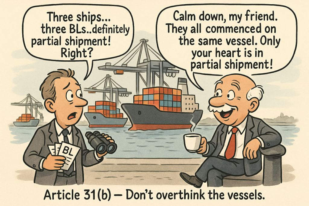 Mr Old Man Payment Q&A “Commencing on the Same Means of Conveyance” — What Exactly Does Article 31(b) Mean? By Mr Old Man Posted on 5 seconds ago 5 min read 0 0 0 Share on Facebook Share on Twitter Share on Google+ Share on Reddit Share on Pinterest Share on Linkedin Share on Tumblr INTRO Every now and then, a single word in UCP 600 sparks an entire chain of questions. This time, it’s the word “commencing” in Article 31(b)—a term that often confuses practitioners when multiple bills of lading, pre-carriage, transshipment, and partial shipments are involved. Below is my detailed response to a reader’s excellent set of questions on how Article 31(b) interacts with ISBP 821 and shipping practices. QUESTION (from Alfred) Article 31(b) induces striking thoughts on the word “commencing”: Does it imply that presented bills of lading should not indicate any pre-carriage vessel, and should not indicate any transshipment vessel? (Meaning: single vessel, multiple port of loading, single port of discharge.) Does Article 31(b) conflict with ISBP para B2(e)(i), which stipulates how to compute the maturity date when a BL indicates more than one on-board notation? The provision for multiple on-board notations is further supported by ISBP para E6(h). If the applicant allows a range of ports or a geographical area as port of discharge, is this self-inflicted and does it permit multiple vessels? More precisely, partial shipment? If a vessel can load from multiple ports, can it not unload at multiple ports? Is Article 31(b) more inclined toward the beneficiary? ANSWER Dear Alfred, Thank you for your interesting questions. I have reviewed UCP 600 sub-article 31(b) and offer the following comments on each point: Does sub-article 31(b) imply that bills of lading should not show pre-carriage or transshipment vessels? No. Sub-article 31(b) addresses when multiple transport documents are still not considered partial shipments if they evidence shipment commencing on the same means of conveyance and for the same journey. The term “commencing” simply refers to the main ocean vessel on which the actual shipment begins. It does not prohibit: mentioning a pre-carriage vessel, or indicating transshipment, if permitted by the LC. Therefore: A bill of lading showing pre-carriage is not a discrepancy. A bill of lading may show transshipment if allowed by the LC. Does sub-article 31(b) conflict with ISBP 821 para B2(e)(i)? There is no conflict. Sub-article 31(b) deals with whether multiple transport documents constitute partial shipment. ISBP 821 B2(e)(i) explains how to compute maturity date when a transport document shows multiple dated on-board notations. They apply to different issues and operate independently. Does allowing a geographical range as “Port of discharge” permit unloading at more than one port? UCP 600 and ISBP 821 do not expressly define this situation. However, the standard banking interpretation is: A geographical range identifies alternative ports—not multiple ports of discharge. The destination is still considered “one and the same destination.” Therefore, this does not itself authorize unloading at more than one port unless the LC clearly allows it. Is sub-article 31(b) more favourable to the beneficiary? It does give the beneficiary additional flexibility, because: shipment can occur in more than one lift, multiple transport documents may be issued, yet the presentation is still not treated as partial shipment, provided all shipments commence on the same vessel, for the same journey, to the same destination. Whether this is “beneficiary-friendly” or simply practical depends on perspective, but sub-article 31(b) certainly allows the beneficiary to work more flexibly within a single voyage. Best regards, Mr. Old Man