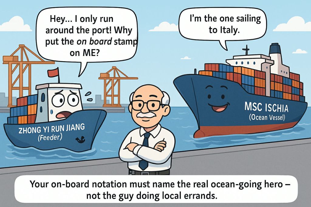 Mr Old Man Payment Q&A Feeder Vs. Ocean Vessel: Which One Must the On Board Notation Indicate? By Mr Old Man Posted on 23 hours ago 4 min read 0 0 5 Share on Facebook Share on Twitter Share on Google+ Share on Reddit Share on Pinterest Share on Linkedin Share on Tumblr Intro Under a port-to-port LC (fields 44E and 44F), the bank expects a marine bill of lading that evidences shipment on board the ocean-going vessel performing the voyage from the stated port of loading to the stated port of discharge. In practice, many BLs also show a pre-carriage or feeder vessel, and this sometimes leads to an on-board notation being placed on the wrong ship — even when the place of receipt and port of loading are the same. Domenico’s case is a perfect example of this common but critical mistake. QUESTION Dear, I have a credit with a port-to-port routing: 44E: ANY PORT IN CHINA – 44F: LA SPEZIA PORT, ITALY The presented BL is a received for shipment BL and contains: Pre-carried by: V.2543E / ZHONG YI RUN JIANG Vessel: MSC ISCHIA – Voy. FD545W Place of Receipt: Wuhan Port of Loading: Wuhan Port of Discharge: La Spezia Place of Delivery: La Spezia On-board notation states: “Loaded on board M/V ZHONG YI RUN JIANG, Voyage 2543E, at Wuhan on 2025.10.31.” Question: Is this on-board notation correct? Thanks for your answer. Regards, Domenico _________ ANSWER Dear Domenico, Thank you for your question. According to ICC’s Recommendations in Respect of the Requirements for an On Board Notation (Document 470/1128), when a bill of lading shows: a place of receipt different from the port of loading, and there is pre-carriage, then the rules for a valid on-board notation are the same whether the BL is pre-printed shipped on board or received for shipment: The dated on-board notation must state the name of the ocean-going vessel that actually performs the port-to-port carriage. It must also indicate the port of loading. The date of this notation is taken as the date of shipment. In your document: ZHONG YI RUN JIANG is clearly the pre-carriage (feeder) vessel. MSC ISCHIA is the ocean vessel for the China → Italy leg. However, the on-board notation states loading on board ZHONG YI RUN JIANG—the feeder vessel—not MSC ISCHIA. Under ICC guidance, this is not acceptable for a port-to-port LC. Therefore, the BL is discrepant due to an incorrect on-board notation. For a deeper dive into this frequent confusion, you may find this useful: “Feeder Vessel vs. Ocean Vessel – Can They Be the Same?” https://mroldman.net/feeder-vessel-vs-ocean-vessel-can-they-be-the-same/ Best regards, Mr. Old Man