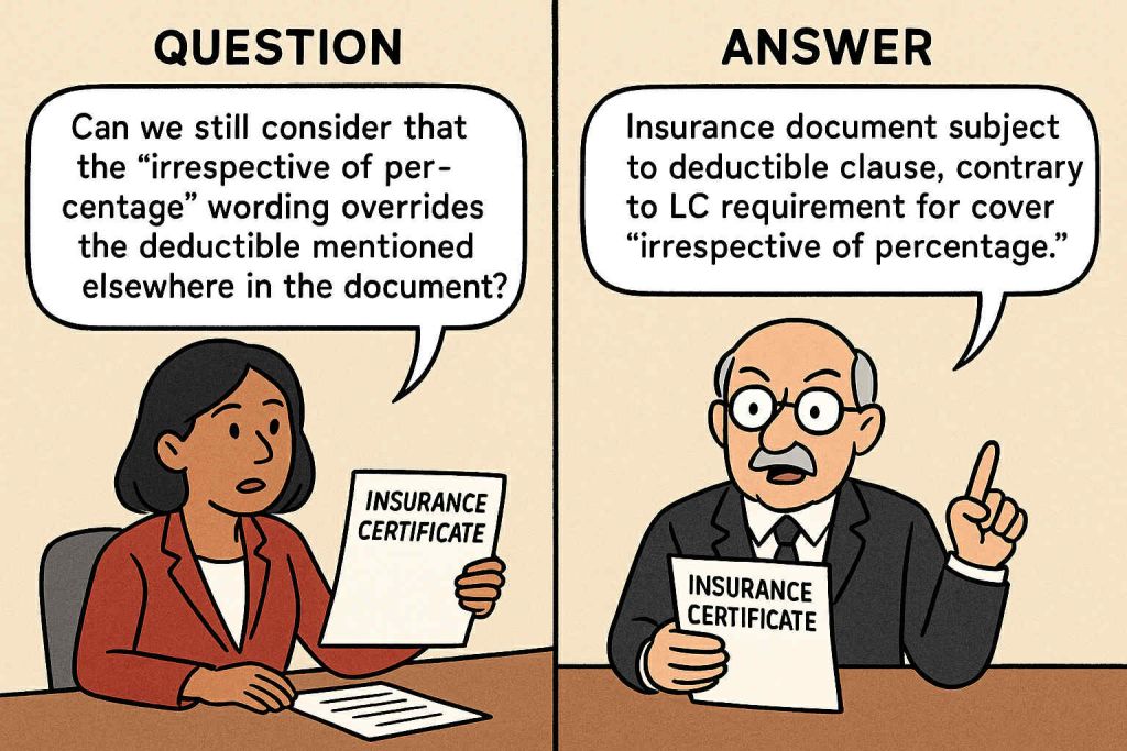 Mr Old Man Payment Q&A Irrespective of Percentage vs. Deductibles – A Conflict in Insurance Documents under LCs By Mr Old Man Posted on September 2, 2025 2 min read 0 0 45 Share on Facebook Share on Twitter Share on Google+ Share on Reddit Share on Pinterest Share on Linkedin Share on Tumblr One of the recurring issues in LC operations is how to handle insurance documents that contain both the phrase “irrespective of percentage” and a deductible clause. Traders often assume the “irrespective of percentage” wording will override the deductible, but under UCP 600 and ISBP 821, the story is different. Let’s look at a real case. __________ QUESTION Dear Mr. Old Man, LC requirement is for Insurance certificate to cover “irrespective of percentage.” The presented Insurance certificate covers the clauses required in the LC and also indicates “irrespective of percentage.” However, at the bottom, it additionally states: “deductible for each and every occurrence: 0.5% of the consignment.” Can we still consider that the “irrespective of percentage” wording overrides the deductible mentioned elsewhere in the document? Regards, Rohini _______ ANSWER Dear Rohini, Thank you for your question. According to ISBP 821 paragraph K14, an insurance document may state that cover is subject to a franchise or deductible. However, when a credit requires insurance cover “irrespective of percentage,” the document must not include any clause making the cover subject to a franchise or deductible. In this case, although the certificate mentions “irrespective of percentage,” it also specifies a deductible of 0.5% of the consignment. This conflicts with the LC requirement and constitutes a discrepancy under UCP 600 sub-article 14(d) and ISBP 821 K14. Conclusion: The “irrespective of percentage” wording does not override the deductible clause. You may raise a discrepancy: “Insurance document subject to deductible clause, contrary to LC requirement for cover ‘irrespective of percentage.’” Best regards, Mr. Old Man