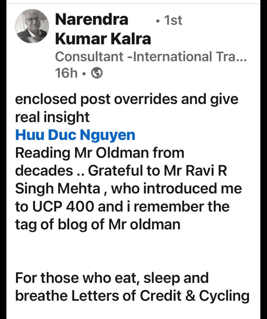 Articles Lifestyle Mr Old Man Payment Q&A Once in a while, a little flower falls my way By Mr Old Man Posted on 1 week ago 56 second read 0 0 29 Share on Facebook Share on Twitter Share on Google+ Share on Reddit Share on Pinterest Share on Linkedin Share on Tumblr Not money from the sky, but a kind mention from Narendra Kumar Kalra, a respected international trade consultant, who shared my post “Sanctions vs. Honour: What If the LC Has No Sanctions Clause?” on LinkedIn. For someone long “retired from the battlefield,” being remembered by fellow trade finance professionals — and seeing that old slogan still alive — “For those who eat, sleep & breathe Letters of Credit & Cycling” — is truly heartwarming. Thanks, Narendra, for making my midweek so much brighter. Best regards, Mr. Old Man