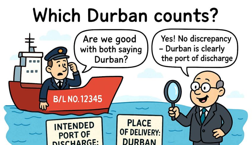 When the Bill of Lading indicates “Intended Port of Discharge” and “Place of Delivery” — What does ISBP 821 E8(b) say? 10 Nov 2025 Sometimes a Bill of Lading can make bankers frown for all the wrong reasons. We’ve seen cases where it shows an “intended port of loading” and that’s fine under UCP 600, but what about when it shows an “intended port of discharge” instead? Does that make it discrepant? Let’s see what happens when Durban plays both roles — as the …