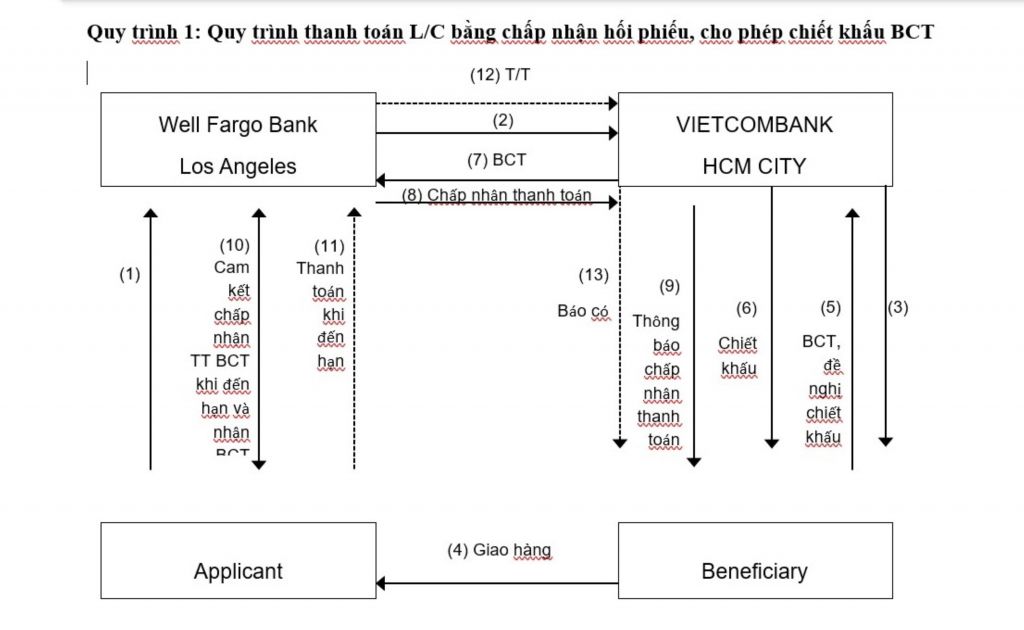 Do VCB HCMC là NHCĐ nhưng không phải là NHXN nên VCB HCMC có thể đồng ý chiết khấu với điều kiện là sau khi hối phiếu trả chậm được NHPH chấp nhận và có thể thỏa thuận chiết khấu có truy đòi hoặc miễn truy đòi. Trong trường hợp này thì Quy trình 2 được áp dụng.